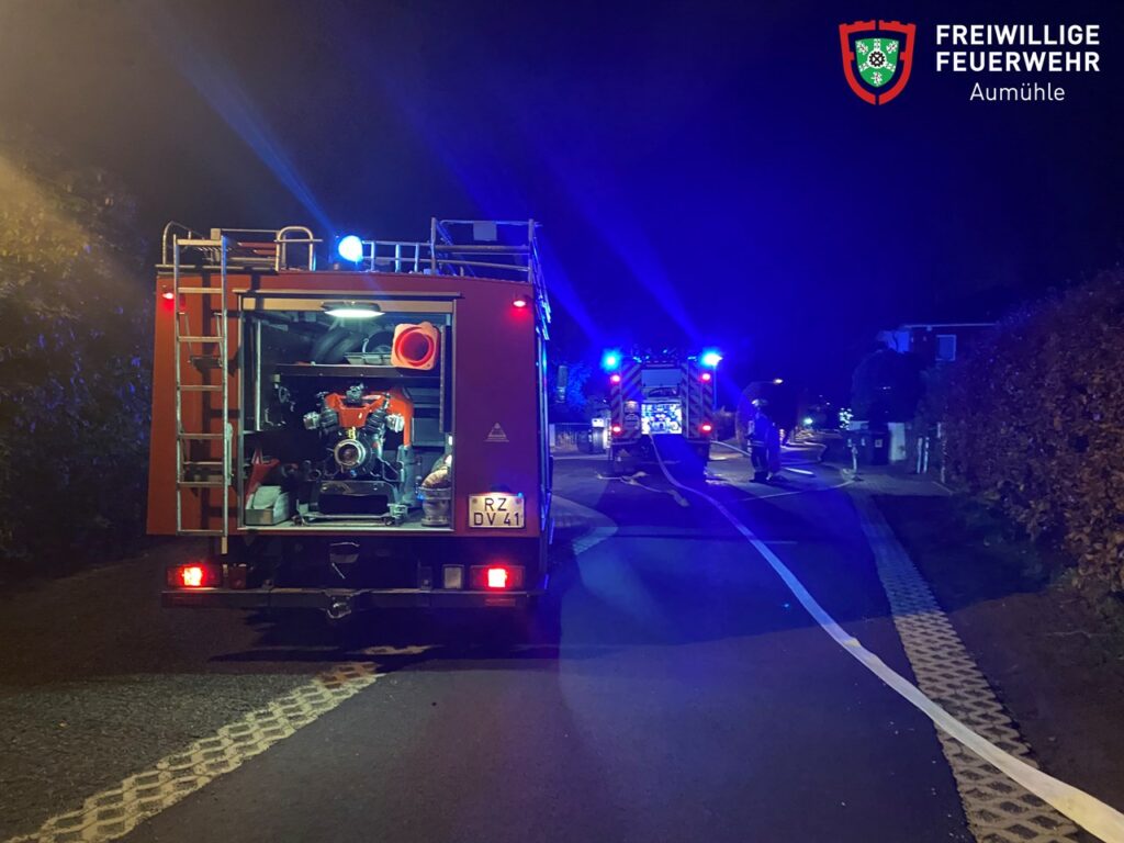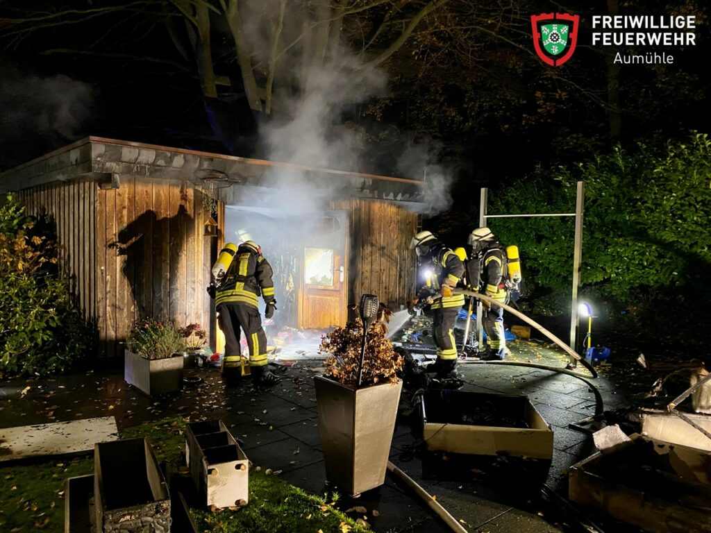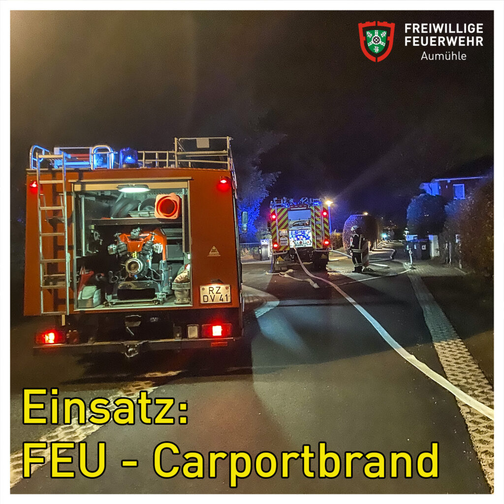 Während des wöchentlichen Übungsdienstes wurde die FF Aumühle zu einem Carportbrand alarmiert. Schon auf der Anfahrt war eine Rauchsäule über dem Objekt erkennbar und der Einsatzleiter forderte umgehend weitere Kräfte nach. Vor Ort ergab die Erkundung, dass es zu einem Feuer in einem Geräteschuppen, angrenzend an ein Carport, gekommen war.