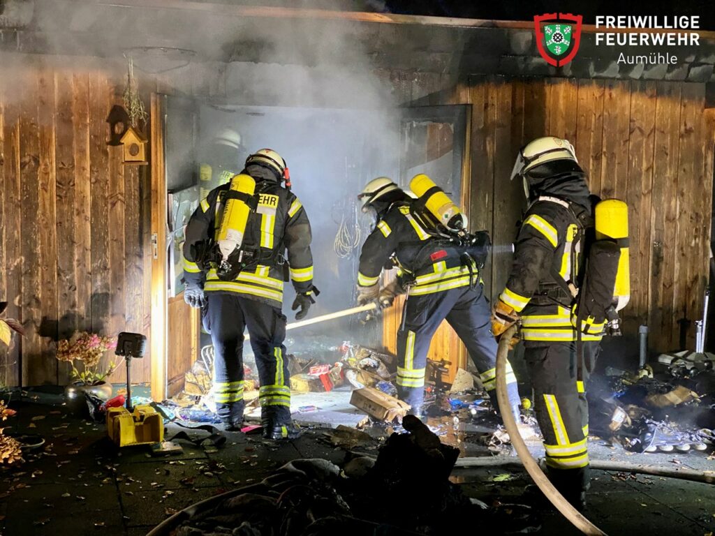 Zwei Trupps mit umluftunabhängigem Atemschutz konnten das Feuer schnell unter Kontrolle bringen und das Brandgut aus dem Schuppen räumen. Im Freien wurden verbleibende Glutnester abgelöscht.