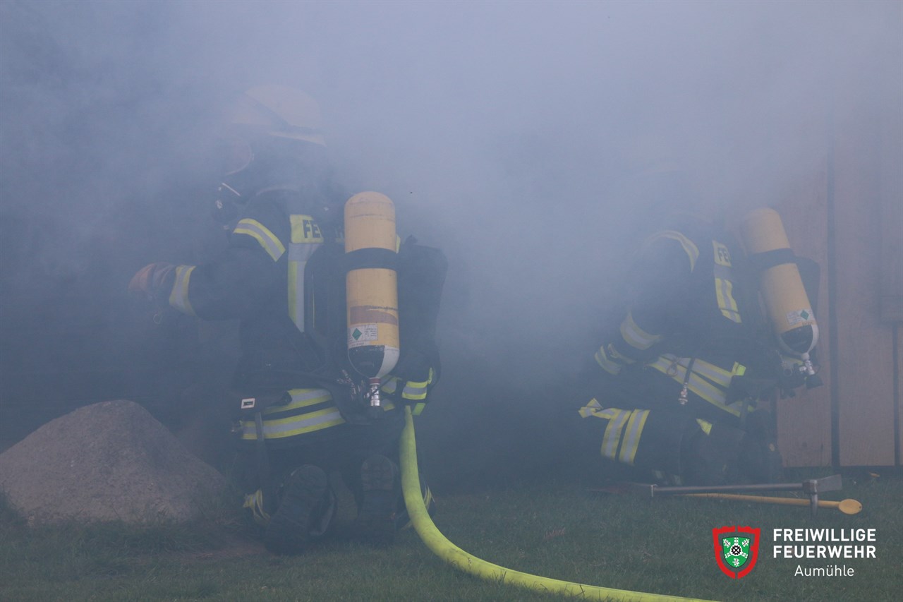 Mit diesen Informationen stand fest, dass es sich hier nicht um ein kleines Feuer handelte, sondern um ein „Feuer Y“, sprich ein Feuer mit Menschenleben in Gefahr, für das mehr Einsatzkräfte erforderlich sind. Umgehend wurde dies an (Übungs-)Leitstelle gemeldet und entsprechende Maßnahmen durch den Einsatzleiter eingeleitet. Neben der sofortigen medizinischen Erstversorgung der verletzten Person wurde der erste Angriffstrupp mit Atemschutz vom Hilfeleistungslöschgruppenfahrzeug mit der Menschenrettung beauftragt. Das inzwischen ebenfalls eingetroffene Löschgruppenfahrzeug der Feuerwehr Aumühle baute die Wasserversorgung vom nahegelegenen Hydranten auf. Im weiteren Einsatzverlauf konnte die vermisste Person zügig gefunden und an den simulierten Rettungsdienst übergeben werden. Der Schuppen war dann schnell gelöscht, da in diesem Fall lediglich die Nebelmaschine ausgeschaltet werden musste.