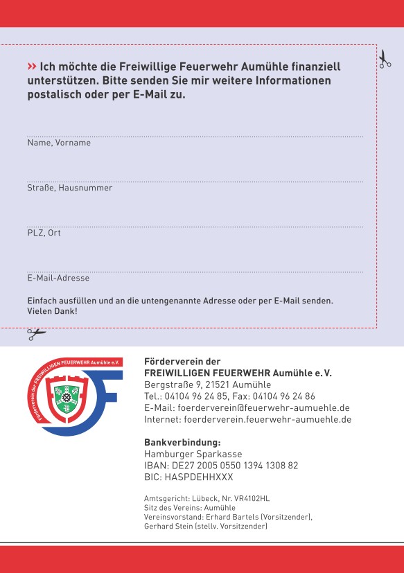 Wir würden uns freuen, wenn Sie Sich für eine dieser Möglichkeiten entscheiden und damit weiterhin die Arbeit der Freiwilligen Feuerwehr Aumühle maßgeblich unterstützen.